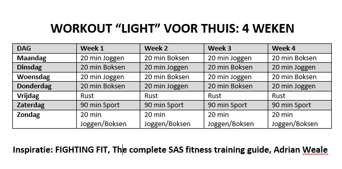 4 Weken Trainingsprogramma “Light” Het Programma Benodigdheden SportkledijTablet of PC Workout Inspiratie 20 min Boksen: LINK Dit delen: Klik om te delen op X (Opent in een nieuw venster) X Klik om te delen op Facebook (Opent in een nieuw venster) Facebook Vind-ik-leuk Aan het laden... Gerelateerd