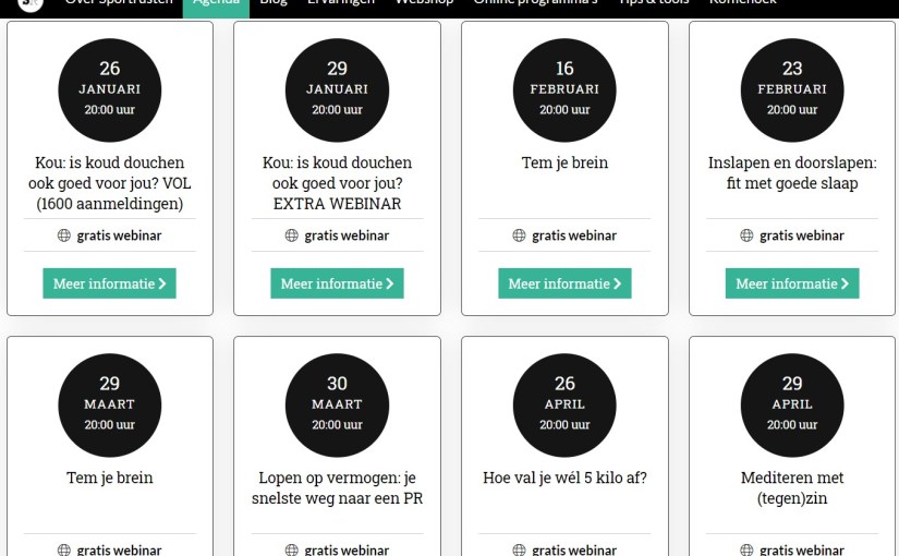 Gratis: Inspirerende Webinars van Koen de Jong Hoe inschrijven? Link: https://www.sportrusten.nl/agenda/ Overzicht geplande Webinars: Dit delen: Klik om te delen op X (Opent in een nieuw venster) X Klik om te delen op Facebook (Opent in een nieuw venster) Facebook Vind-ik-leuk Aan het laden... Gerelateerd
