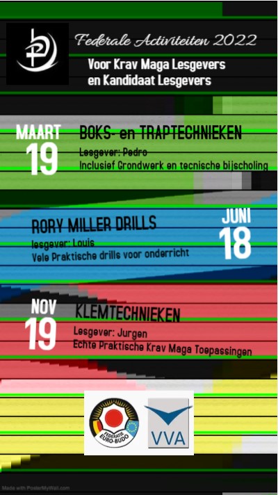 - 19/03/2022: Federale Training door Pedro (Boks- en Traptechnieken en Grondwerk). Een ‘must’ als Krav Maga lesgever of Krav Maga kandidaat lesgever met tal van praktische tips om uw leden te onderrichten.